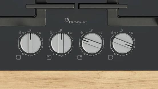 Эргономика управления реализована с помощью поворотных элементов, удобных для интуитивного выбора интенсивности; автоматический электроподжиг делает использование простой процедурой — достаточно повернуть ручку, и пламя вспыхнет само. Система FlameSelect предоставляет девять ступеней мощности, позволяя добиться точного температурного режима и стабильного горения при приготовлении самых разных блюд, от томления до быстрого обжаривания. Наличие отдельной WOK-конфорки повышенной мощности (3,5 кВт на задней правой позиции) пригодится для интенсивной термообработки и блюд азиатской кухни, тогда как передние и задние левые горелки по 1,75 кВт и передняя правая 1 кВт дают гибкость при выборе посуды и режима.