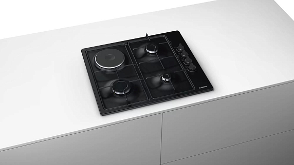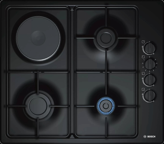 Варочная панель Bosch PBY6C6B80O оснащена 4 конфорками среди них имеется электрическая, также имеется газ-контроль. Чугунные решетки обеспечат устойчивость посуды. Автоматический электроподжиг позволит зажигать пламя без особых усилий.