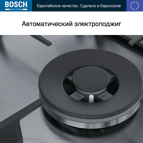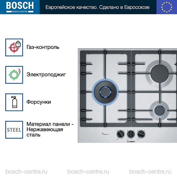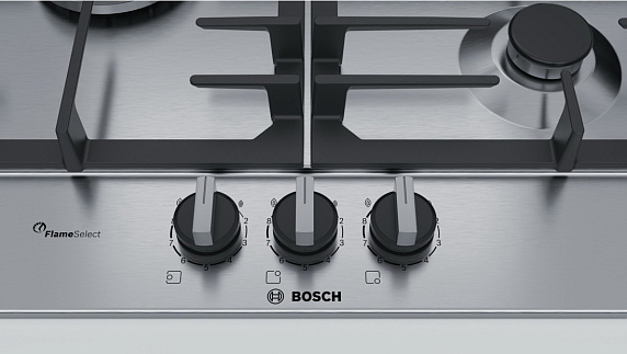 Газовая варочная панель Bosch PCC6A5B90 на 3 конфорки, шириной 58.2 см, нержавеющая сталь