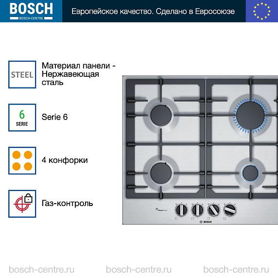 Газовая варочная панель Bosch PCP6A5B90 на 4 конфорки, шириной 58.2 см, нержавеющая сталь