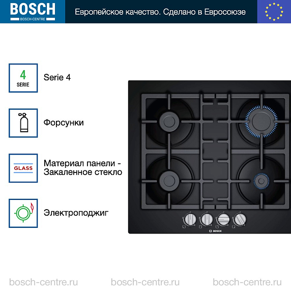 Газовая варочная панель Bosch PNP6B6B90 на 4 конфорки, шириной 59 см, черный