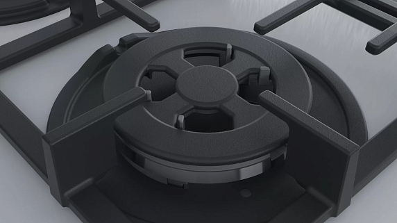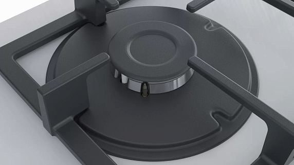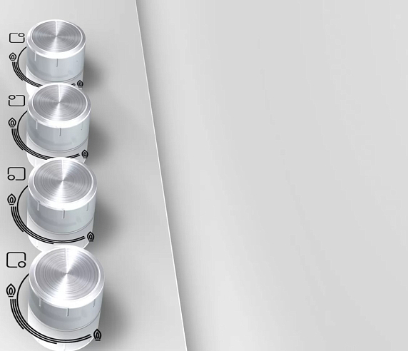 На белой панели из закаленного стекла располагаются 4 конфорки, над которыми размещены решетки из чугуна. Газовая варочная панель дополнена функцией электроподжига с механизмом, встроенным в поворотные переключатели. Комфортной и безопасной работе системы способствует наличие газ-контроля. DualWok-конфорка незаменима для любителей азиатской кухни, которые готовят на посуде с закругленным дном.
