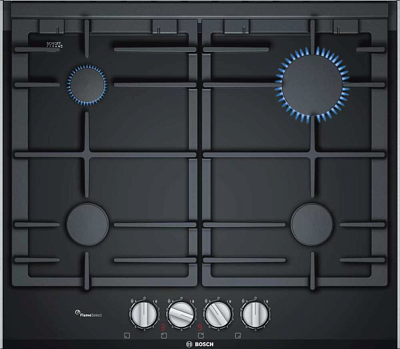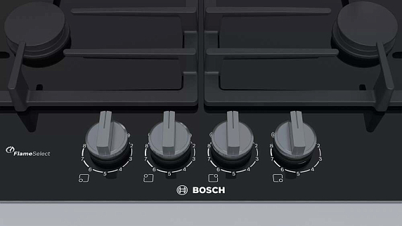 Варочная панель Bosch PRP6A6D70 позволяет точно регулировать пламя благодаря специальным регуляторам FlameSelect. Материал поверхности устройства изготовлен из стеклокерамики. Решетки изготовлены из прочного чугуна.