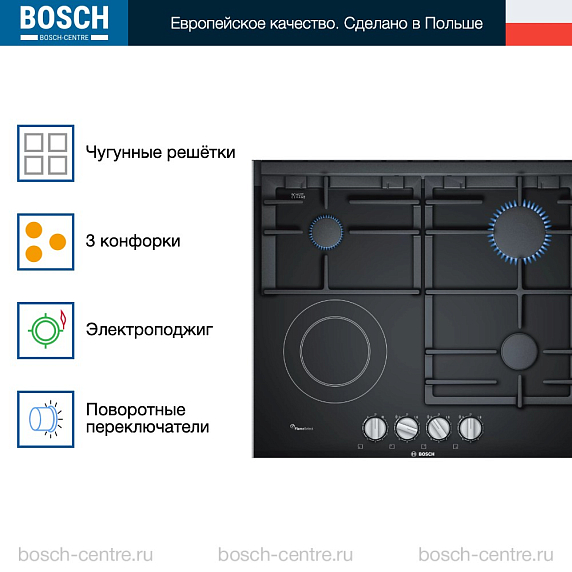 Варочная панель Bosch PRY6A6B70Q произведена в Польше и обладает 12-месячной гарантией от производителя, что подтверждает ее высокое качество и надежность.