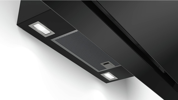 Забор воздуха по периметру гарантирует эффективную очистку, класс эффективности вытяжного вентилятора данной модели — А. Стеклянная панель закрывает металлический жировой фильтр, который можно вынуть для мытья в посудомоечной машине. Сенсорное управление Touch Select на передней панели позволяет переключать режимы легким касанием. Возможен монтаж без воздуховода для работы только в режиме рециркуляции.