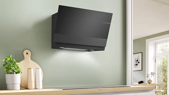Вытяжка Bosch DWK81AN65 сочетает смелый черный тон корпуса и дымохода с матовой нержавеющей сталью, дополненной тонким стеклянным экраном, создающим выразительный акцент на кухонном пространстве. Компактная глубина 43.3 см и ширина 79 см позволяют органично встроить технику в настенный монтаж, сохраняя визуальную легкость благодаря вытянутой вертикали: стандартная высота 47.5 см и возможность увеличения до 109.8 см обеспечивают гибкость установки под разные потолки и планировки. Такой профиль выгодно открывает рабочую поверхность и оптимизирует поток воздуха, при этом масса изделия в 25.1 кг гарантирует устойчивость конструкции при эксплуатации.
