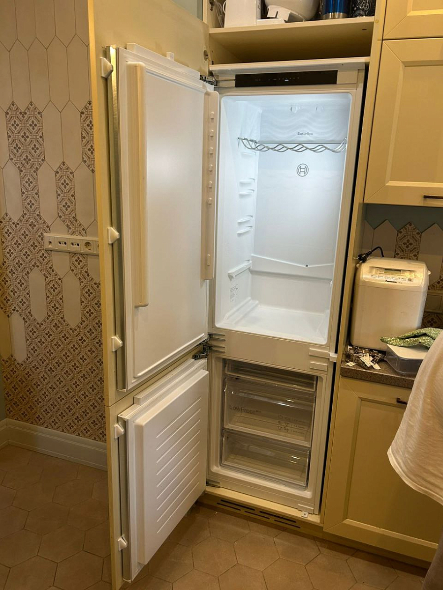Хочу поделиться впечатлениями от встраиваемого холодильника Bosch KIV86VFE1 — он стал настоящей находкой для нашей кухни! Во-первых, очень радует его двухкамерная конструкция с морозильником снизу: это не только удобно с точки зрения эргономики (чаще пользуешься холодильной камерой, и она на уровне глаз), но и выглядит стильно и современно. Встроенный дизайн идеально вписался в наш гарнитур — теперь кухня выглядит цельной и аккуратной, без выступающих частей. Объём холодильной камеры (183 литра) для семьи из трёх человек более чем достаточен: всё размещается без толкотни, особенно нравится грамотная организация пространства — полки регулируются по высоте, а ящики для овощей герметичные и вместительные. Морозильная камера на 84 литра тоже радует: уместилось всё, что нужно на пару недель вперёд, включая замороженные ягоды, мясо и даже запасы на праздники. Уровень шума минимальный — ночью вообще не слышно, а это для меня очень важно, ведь кухня у нас совмещена со спальней.