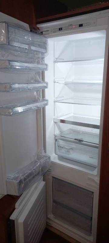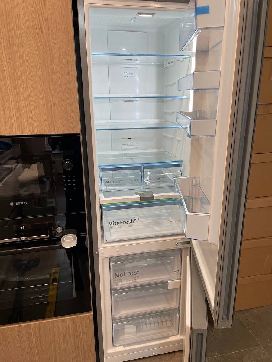 Как хозяйка, которая много времени проводит на кухне, я в восторге от этого встраиваемого Bosch! Главное преимущество — зона свежести VitaFresh: зелень теперь остаётся хрустящей почти неделю, а ягоды не портятся через два дня, как раньше. Это настоящая находка для тех, кто закупается на выходные или любит свежие овощи. Очень ценю технологию FreshSense — температура внутри поддерживается стабильно, даже когда я часто открываю дверцу во время готовки. Светодиодная подсветка равномерно освещает всё пространство, ничего не прячется в тени, и я всегда вижу, что лежит на задней полке. Электронное управление с дисплеем выглядит стильно и интуитивно понятно: одна кнопка — и активируется режим быстрой заморозки для свежих ягод или мяса. Приятно, что холодильная камера размораживается автоматически — никаких луж и льда под полками по утрам. Большой ящик BigBox в морозилке удобно вместил целую упаковку мяса для праздничного стола, а система LowFrost заметно сократила образование инея — теперь размораживать приходится раз в пару месяцев, а не еженедельно.