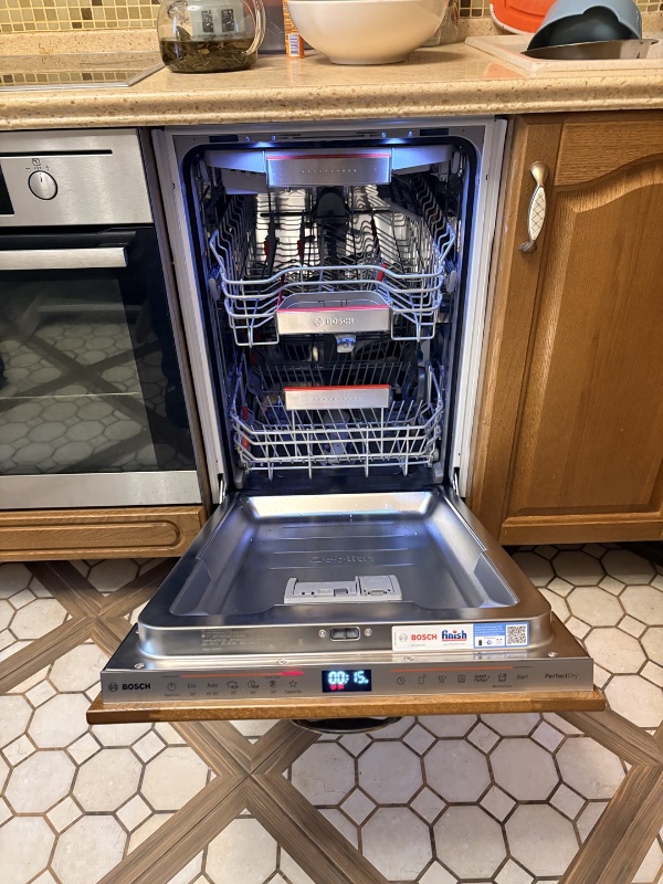 Пользуюсь этой встроенной машиной несколько недель и очень благодарна за то, как она упростила будни. У нас маленький ребёнок, и уровень шума около 42 дБ позволяет запускать ночную программу, не нарушая сна. Часто готовлю для семьи и друзей — функция SpeedPerfectPlus выручала, когда нужно было быстро отмыть тарелки после обеда. Цеолитная сушка действительно лучше справляется со стаканами и ложками, они выходят сухими и без разводов, а бережная программа для стекла при 40°C сохранила пару хрупких бокалов, которые раньше оставались пятнистыми.