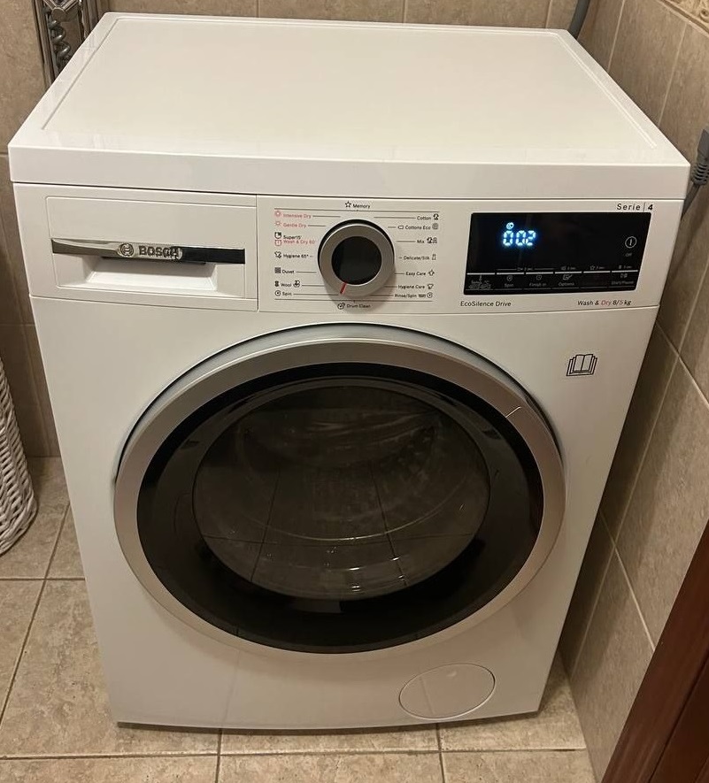 Эта стиральная машина с сушкой из серии Serie 4 стала настоящим спасением в моём быту. Особенно ценю сочетание фронтальной загрузки и функции сушки — теперь не нужно таскать мокрое бельё в отдельную сушилку или ждать, пока оно высохнет на верёвке. Стирка на 8 кг и сушка на 5 кг — более чем достаточно для семьи из троих человек, даже с учётом постельного белья или спортивной формы. Очень удобен отложенный старт на 24 часа: загружаю машинку вечером, выставляю старт на ночь (когда тарифы на электричество ниже), а утром уже достаю чистое и высушенное бельё. Управление интуитивно понятное — поворотный переключатель и сенсорные кнопки работают чётко, а многофункциональный LED-дисплей наглядно показывает время до окончания цикла. Акустический сигнал в конце программы — мелочь, но очень полезная: больше не приходится постоянно заглядывать в ванную, чтобы проверить, всё ли готово.