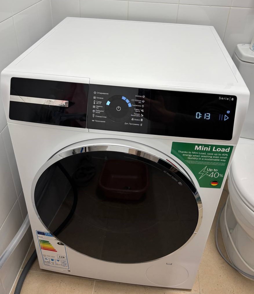 Покупкой осталась полностью довольна! Эта стиральная машина — сочетание немецкого качества, интеллектуальных технологий и заботы о пользователе. Она не только справляется с повседневной стиркой, но и умеет бережно обращаться с любимыми вещами — шерстяными свитерами, шелковыми блузками, даже пуховым одеялом. Управление интуитивно понятное, дисплей чёткий, интерфейс — без лишних сложностей. Особенно ценю, что можно точно видеть время до окончания программы — это сильно упрощает планирование дня. Если вы ищете надёжную, умную и стильную технику для дома — Bosch Serie 8 точно достоин внимания. Рекомендую без колебаний!