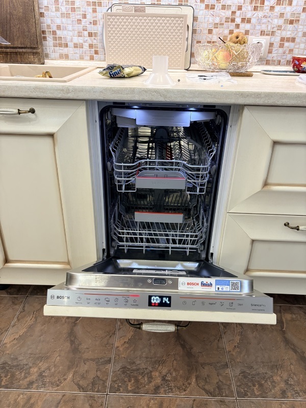 Покупка узкой встраиваемой посудомоечной машины Bosch серии 6 стала одним из лучших решений для обновления нашей кухни. Мы долго выбирали между разными брендами, но наличие 10 комплектов посуды в таком компактном корпусе убедило нас в правильности выбора для нашей семьи из четырех человек. Машина справляется даже с сильно загрязненной посудой после праздничного ужина благодаря программе «Интенсивная», а датчик AquaSensor сам определяет степень загрязнения воды и экономит ресурсы, что приятно сказывается на счетах за коммунальные услуги. Очень радует внутренняя подсветка — теперь не нужно включать свет на кухне, чтобы проверить, чисто ли вымыты тарелки или не забыли ли мы положить ложку. Функция «Моя программа» позволила мне сохранить идеальный баланс температуры и времени, который подходит именно под наш ритм жизни и типичный набор посуды. Дизайн в цвете нержавеющей стали смотрится дорого и гармонично вписался в интерьер, а закрытая панель управления делает фасад кухни единым целым. Сигнал окончания программы звучит деликатно, но заметно, так что я никогда не пропускаю момент, когда можно разгружать чистую посуду. В целом, это устройство не просто моет посуду, а реально экономит мое время и нервы, делая быт значительно комфортнее и современнее. Рекомендую всем, кто ценит тишину, умные технологии и безупречное качество очистки.