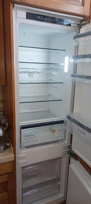 Как хозяйка, которая много времени проводит на кухне, я в восторге от этого встраиваемого Bosch! Главное преимущество — зона свежести VitaFresh: зелень теперь остаётся хрустящей почти неделю, а ягоды не портятся через два дня, как раньше. Это настоящая находка для тех, кто закупается на выходные или любит свежие овощи. Очень ценю технологию FreshSense — температура внутри поддерживается стабильно, даже когда я часто открываю дверцу во время готовки. Светодиодная подсветка равномерно освещает всё пространство, ничего не прячется в тени, и я всегда вижу, что лежит на задней полке. Электронное управление с дисплеем выглядит стильно и интуитивно понятно: одна кнопка — и активируется режим быстрой заморозки для свежих ягод или мяса. Приятно, что холодильная камера размораживается автоматически — никаких луж и льда под полками по утрам. Большой ящик BigBox в морозилке удобно вместил целую упаковку мяса для праздничного стола, а система LowFrost заметно сократила образование инея — теперь размораживать приходится раз в пару месяцев, а не еженедельно.