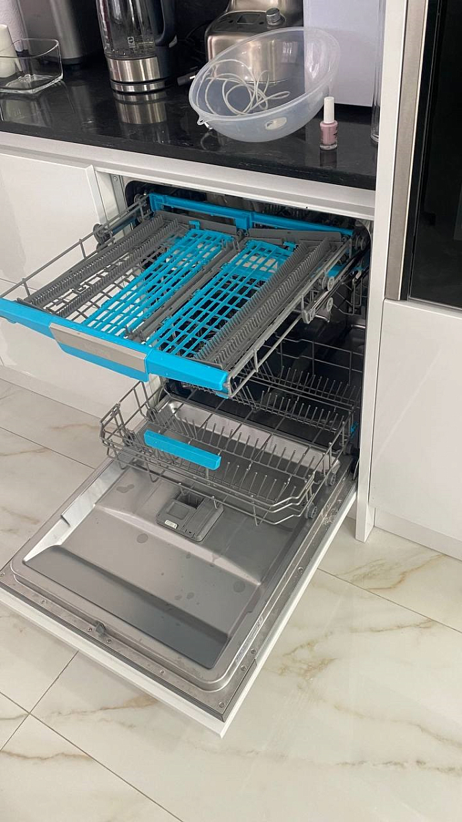 Главное преимущество этой модели — невероятная тишина работы инверторного мотора. Можно запускать мойку ночью и спать абсолютно спокойно, никаких вибраций или гула. Цеолитная сушка работает великолепно, это действительно технология будущего: посуда, особенно пластиковая, выходит полностью сухой и теплой, не нужно приоткрывать дверцу для проветривания. Вместительность на 14 комплектов спасает после семейных праздников, легко помещаются противни и кастрюли. Очень нравится проекция времени на пол TimeLight, не нужно наклоняться к машине, чтобы проверить статус. Стильный черный интерфейс скрыт за фасадом, ничего не нарушает дизайн кухни.