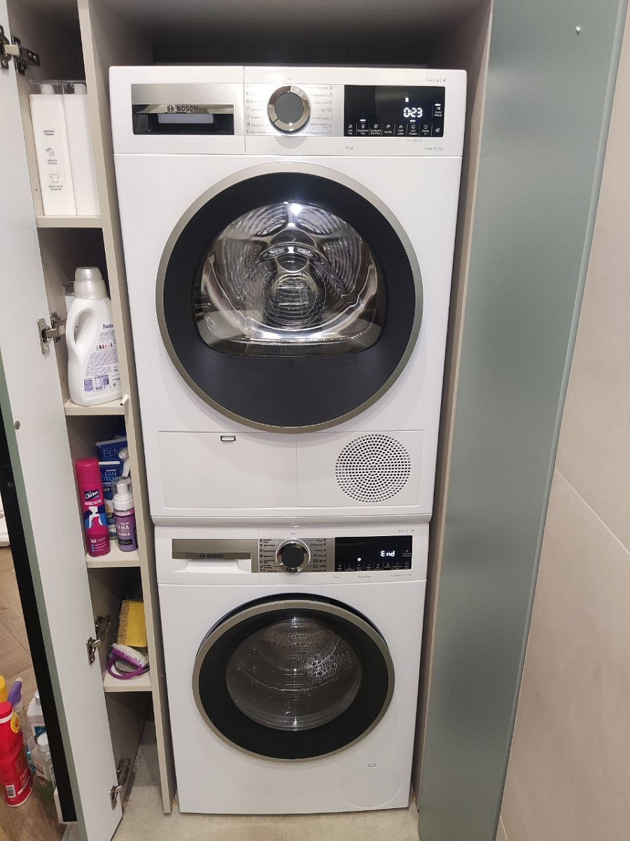 Сушильная машина Bosch Serie | 8 стала настоящим открытием для нашей семьи из четырёх человек. Главное, что поразило с первого использования — технология теплового насоса. Бельё выходит невероятно мягким, без пересушивания, а расход электроэнергии заметно ниже по сравнению с предыдущей моделью. Особенно ценю функцию «Легко гладить»: рубашки мужа и мои блузки после сушки требуют минимум усилий утюгом — складки разглаживаются буквально за пару минут. Вместимость 9 кг — это спасение в выходные: спокойно загружаю все полотенца после ванны, постельное бельё и детскую одежду за один цикл. Отсрочка старта на 24 часа идеально вписалась в наш ритм жизни — запускаю машину ночью по тарифу «ночной электрик», а утром забираю полностью высушенные вещи. Сенсорное управление Touch Control выглядит стильно и откликается мгновенно, а индикация заполнения фильтра и контейнера для конденсата избавляет от догадок — система сама напомнит, когда пора провести обслуживание.