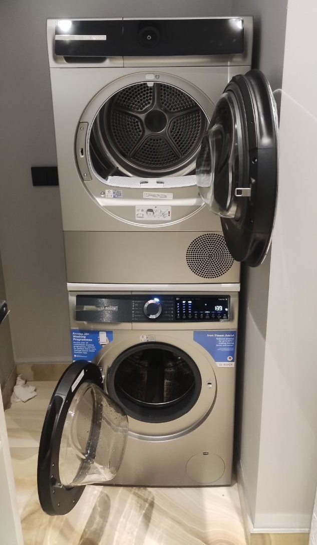 Поставили машину в колонну со стиралкой. Смотрится отлично, не занимает свободное пространство в ванной комнате. Для меня это идеальный выбор для содержания моего белья в идеальном состоянии.